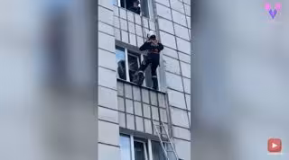 En Perm, Rusia, un bombero se cuelga por la fachada de un edificio para rescatar a un gato atascado en una ventana - YOUTUBE/VIDELO/RUSVID
