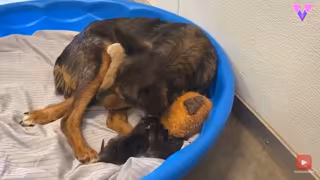 Poco después de llegar a las instalaciones de la organización, el 13 de agosto, la mix de Pastor Alemán se puso de parto y dio a luz a sus cachorros de forma prematura.