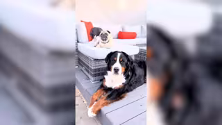 Este mimado carlino viaja a todo lujo con la ayuda de su hermano peludo, que tira de su carruaje. Matt Robertson, de 36 años, de Hertfordshire (Reino Unido), pasó seis meses enseñando a su perro de montaña de Berna de dos años y medio, Buddy, a tirar del carruaje, en el que se sienta orgulloso Winston, el hermano de Buddy, de seis años.