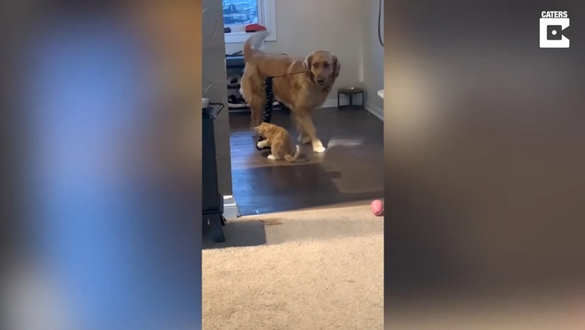 Nashelle Finnbogason, de 27 años, de Manitoba (Canadá), que trabaja en el sector del marketing, descubrió que su perrita Levy había conseguido la fórmula para llamar la atención del gato de una forma novedosa: jugar con sus juguetes.
