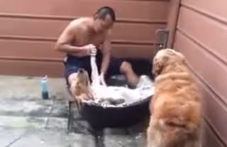 Este simpático perro no tuvo inconveniente en dejarse grabar mientras se prestaba para demostración. En el vídeo podemos observar cómo, completamente tumbado, el animal se deja masajear todos los músculos de su cuerpo mientras el hombre se afana en enjabonarle. Las caras de placer del perro lo dicen todo. De hecho, un segundo perro parece estar nervioso mientras contempla la escena esperando su turno pacientemente.