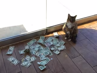 Un buen día Stuart decidió deslizar un billete de dólar debajo de la puerta e inmediatamente el gato saltó a por él hasta arrebatárselo. Así fue como descubrió lo que el gato hacía por las noches. Al parecer Whine animaba a los transeúntes a jugar con él a través de la puerta de cristal usando billetes de dólar como juguete.