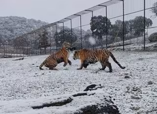 La histórica nevada en la Comunidad de Madrid y la posterior ola de frío ha dejado muchas imágenes llamativas en la capital, como la de los tigres, leones y demás animales del Safari Madrid jugando en la nieve.