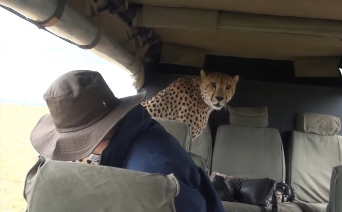 Durante un safari en el Parque Nacional de Masai Mara, un grupo de turistas atravesaba la zona de los felinos salvajes en coche cuando un curioso guepardo se acercó más de lo debido. Tanto, que de un salto se coló dentro del vehículo ante la atenta mirada de todos.