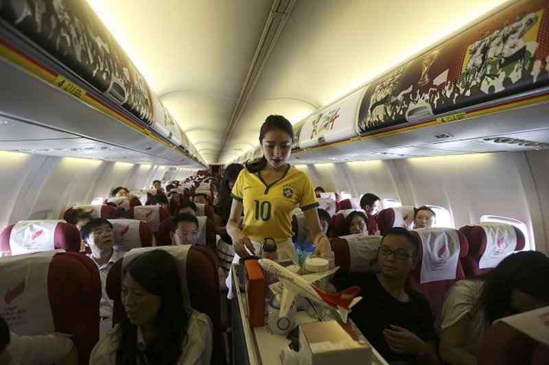 Una asistente de vuelo viste una camiseta de la selección brasileña de fútbol mientras ofrece café o té a los pasajeros de un vuelo que cubría la ruta entre Kunming a Hangzhou el pasado 23 de junio. Esta compañía aérea ha renovado el uniforme de las azafatas para celebrar la Copa del Mundo de Brasil 2014 con el fin de atraer más clientes.