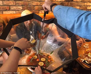 La sangría mejor en un jarra, pero si no hay...pues paraguas al canto