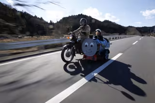 Este hombre y su nieto montan en una motocicleta Honda con sidecar diseñado a partir de un barril de petróleo usado, a las afueras de Tokio.