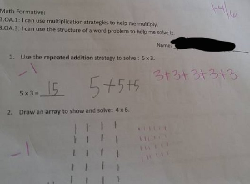 La resolución de la multiplicación 5x3 puede parece sencilla, a simple vista, pero la solución de un estudiante de primaria estadounidense y la posterior corrección de su profesora desataron el debate en Internet.