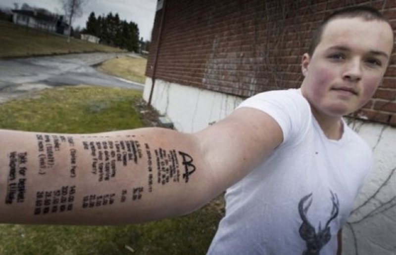 Historias de primeros tatuajes hay muchas pero como la de este chaval ninguna. Stian Ytterdahl, noruego de 18 años, se encontraba cenando un lunes con sus amigos en la cadena de comida rápida por excelencia cuando le propusieron que se tatuara la factura de la cena de ese día en su brazo como castigo por ser tan atractivo para las mujeres. Era eso o tatuarse una muñeca Barbie en el trasero.