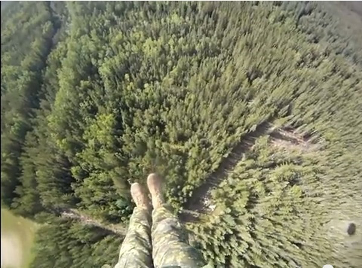 Esto es precisamente la situación que tuvo que afrontar este paracaidista militar del Ejército canadiense tras saltar del avión en unas maniobras y darse cuenta de que no tenía tiempo para cambiar de trayectoria y evitar un más que probable doloroso aterrizaje entre árboles.