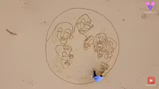 En esta ocasión, el artista creó un hipnótico retrato en un solo trazo utilizando únicamente arena de playa y agua de lluvia con un pulverizador de alta presión.
