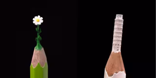 Entre las figuras que ha creado Fidai en la punta de los lápices, podemos encontrar mariposas, osos panda, flores en un jarrón, personajes como Yoda o Spiderman y monumentos como la Estatua de la Libertad o la Torre de Pisa.