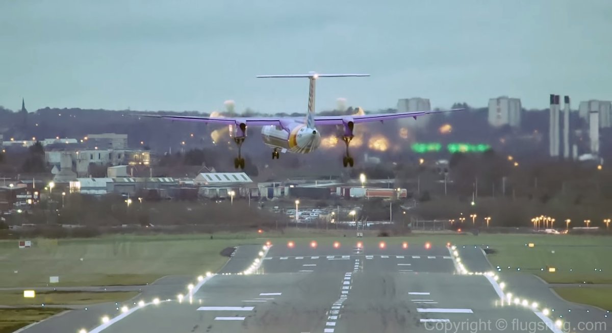 El entusiasta de la aviación Flugsnug ha capturado estas impresionantes imágenes en vídeo en las que se puede ver como varios aviones turbohélice intentan aterrizar en el aeropuerto de Birmihgham en condiciones meteorológicas adversas.