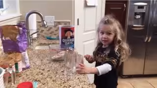 La madre le va cantando cómo debe hacerse en cada momento. Tras un primer trasvase de cereal, la madre le dice a la hija que necesita una taza más de cereal. Aquí viene lo más grande. La niña, en vez de entender 'taza' como unidad de medida, lo entendió como tal, y fue a buscar una a la alacena. La madre, extrañada, se preguntó dónde iba su hija, hasta que vio lo que estaba haciendo. Se dio cuenta de su confusión, le hizo mucha gracia y le instigó a que 'cogiera' otra taza.