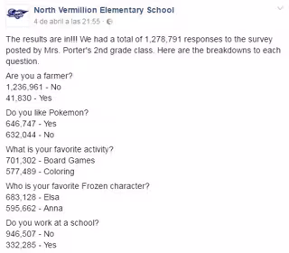 Kara Porter, una profesora del North Vermillion Elementary School de Cayuga, Indiana, que publicó en la página de Facebook del colegio una encuesta que hicieron sus alumnos de primaria. Dicha encuesta ha conseguido una increíble participación de 1.278.791 personas que respondieron a las preguntas de la misma. Porter planteó este ejercicio en su clase para enseñar a los niños qué es una encuesta y su funcionamiento. Su publicación se ha convertido en un fenómeno viral que ha dado la vuelta al mundo entero.