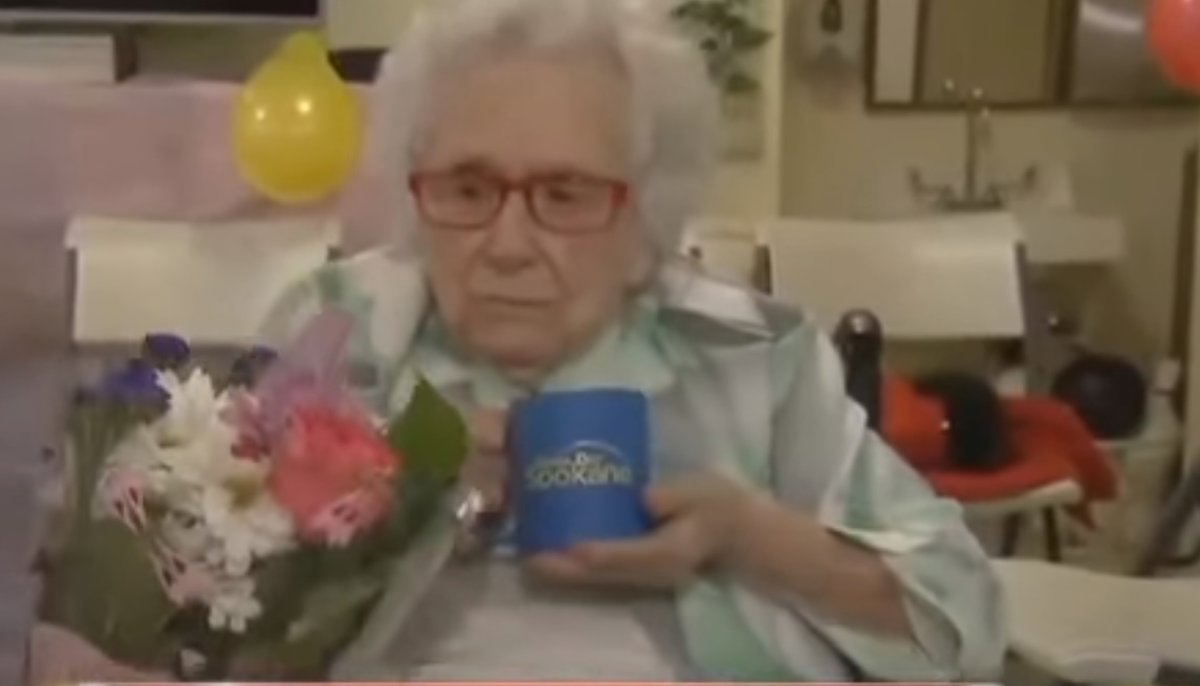 "¿Preferirías dormirte una siesta, no?", comenta la presentadora Mischkle cuando insiste en el cumpleaños de Flossie. "Sí", es la escueta respuesta de esta mujer nacida en 1906, en Oregon.