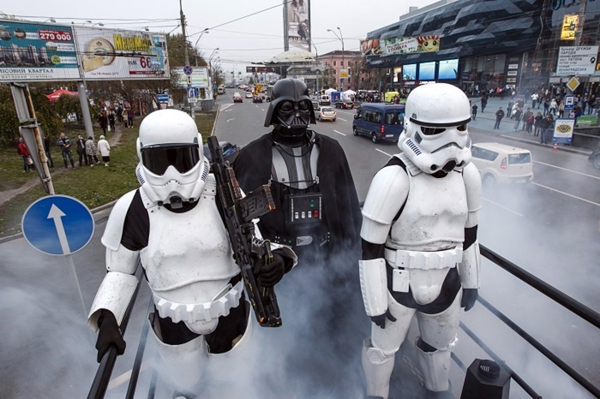 Vader se había encargado de hacer campaña en las calles los días previos a las elecciones parlamentarias anticipadas este domingo 26 de octubre. Subido en lo alto de una furgoneta negra y acompañado de dos personas más vestidas con los trajes de soldados del Imperio de 'Star Wars' recorrió las calles de Kiev el pasado 22 de octubre, después de salir de una reunión con sus partidarios y votantes.