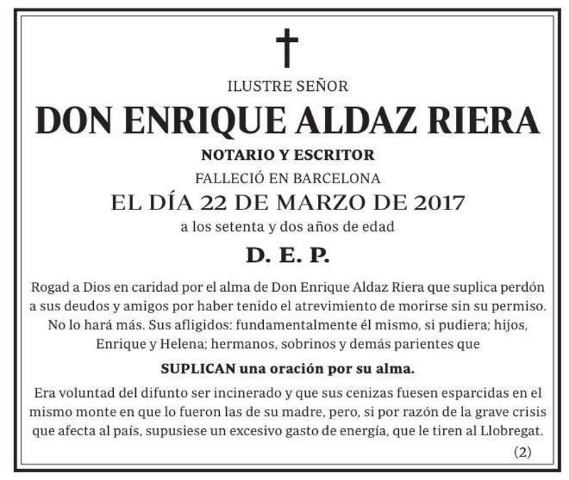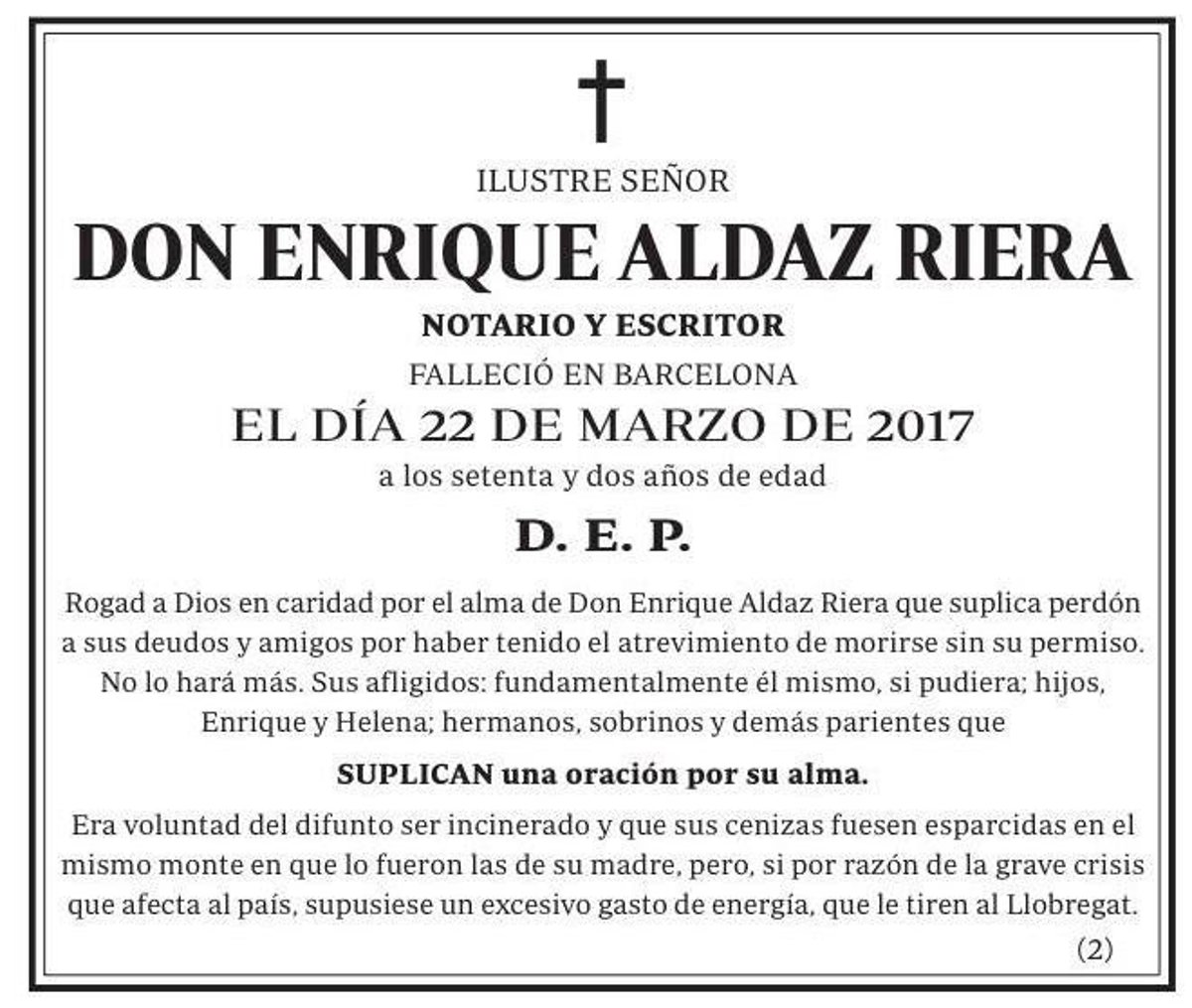 "Rogad a Dios en caridad por el alma de Don Enrique Aldaz Riera que suplica perdón a sus deudos y amigos por haber tenido el atrevimiento de morirse sin su permiso. No lo hará más". Con esta frase empieza la esquela de Enrique Aldaz Riera, un notario y escritor que falleció el pasado día 22 de marzo en Barcelona. Tenía 72 años y un sentido del humor envidiable que le acompañó hasta el final.