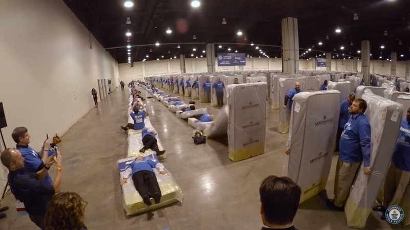 La empresa americana Aaron's Inc. ha batido el récord del mundo del dominó humano con colchón más largo del mundo el pasado 7 de abril, en el que participaron y cayeron suavemente 1.200 personas con sus respectivos colchones. Rompe así el récord de la compañía alemana Höffner Möbelgesellschaft GmbH & Co. De 1.150 colchones y personas.
