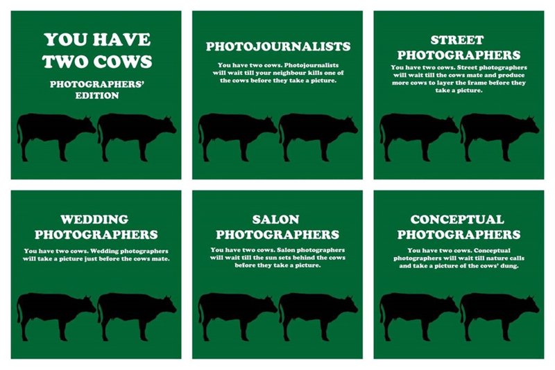 5) Usted tiene dos vacas. Los fotógrafos conceptuales esperarán hasta que la naturaleza llame a la puerta y entonces poder una foto de estiércol de las vacas.