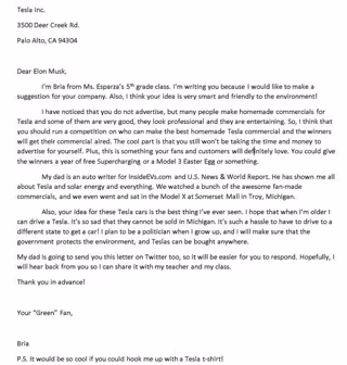 Bria Loveday, una estudiante de quinto grado de Michigan, escribió una carta a Elon Musk en la que le recomendaba una sugerencia para su empresa. La pequeña se había dado cuenta de que muchas personas anónimas se habían animado a elaborar sus propios anuncios caseros de Tesla y que muchos de ellos eran muy buenos.