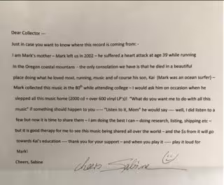 Sabine se ocupa personalmente de ver a quién se lo está vendiendo, para cerciorarse de que queda en buenas manos. De ahí la personalización. En su perfil de Discogs solo tiene comentarios excelentes. Y es que solo con recibir esa carta, ya casi ha valido la pena la compra.