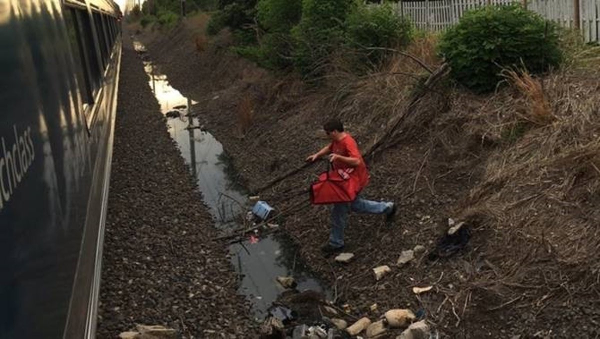 Una apuesta arriesgada y un órdago al repartidor para probar de qué pasta estaba hecho. Lo que no sabía Mitch Katz es que el repartidor que le tocó era de esos llamados héroes. El hombre, pizza en mano, atravesó un terraplén, recorrió las vías corriendo y completó su misión con éxito. Este vídeo recogió el glorioso momento:
