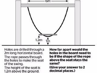 La prueba proporcionada proponía un diagrama de un columpio de cuerda en forma de curva parabólica y pidió a los estudiantes que calcularan la distancia entre los agujeros del asiento del columpio, con los siguientes datos ofrecidos: