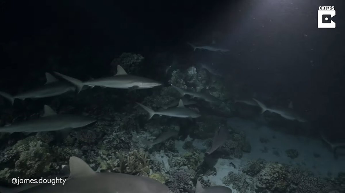 En el vídeo de James, se puede ver a un gran grupo de tiburones grises de arrecife nadando en el agua oscura y cazando a los peces de arrecife más pequeños.