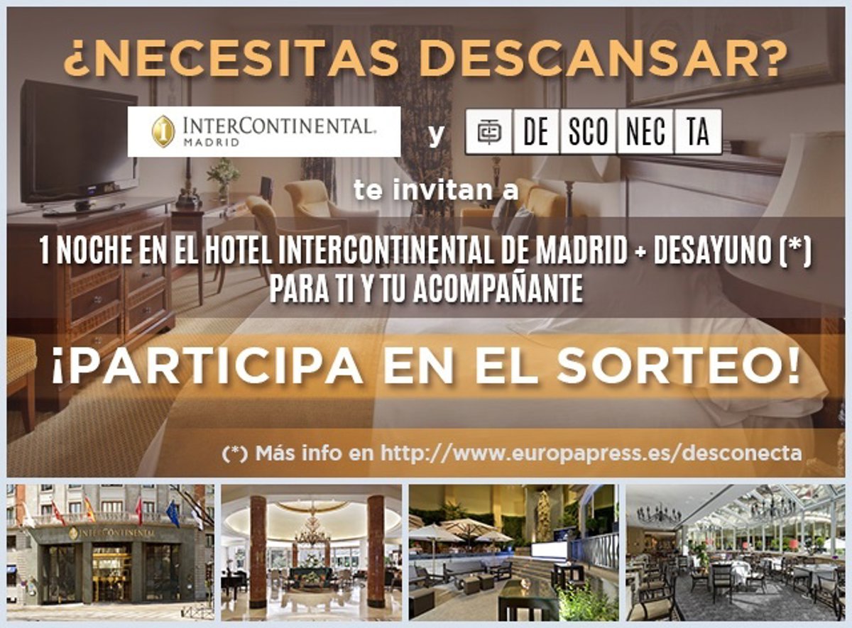 (*) El premio de una estancia para dos personas en noche de sábado+desayuno en el Hotel InterContinental de Madrid estará sujeto a disponibilidad por parte del hotel. El premio tendrá validez de un año a partir de la fecha de lanzamiento del concurso.