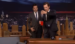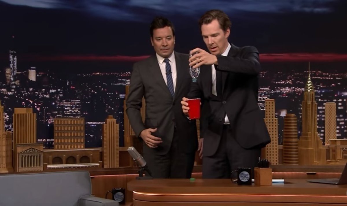 Cumberbatch fue al conocido programa de televisión presentado por Jimmy Fallon. Allí, en mitad de una entrevista, Fallon le conminó a hacer un truco de agua con una botella de agua. El actor accedió. Abrió la botella, le quitó el tapón, puso su mano sobre la abertura, dio la vuelta a la botella y retiró la mano...¡y el agua no cayó! Pero ahí no queda todo. Fíjate en el final del truco, cuando ya parecía que todo había terminado, pasa algo mágico de nuevo...