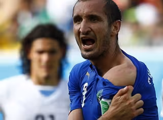Sucedió justo antes del gol de la victoria de Uruguay, donde Suárez tuvo un percance con el defensa Chiellini que les hizo caer al suelo. Entonces, las cámaras captaron las imágenes en que Suárez hundía su cabeza en lo que parecía una mordida en el hombro del italiano. El árbitro no vio ni pitó la falta pero cuando el defensa italiano se levantó la camiseta aparecieron lo que se asemejan marcas de mordida.