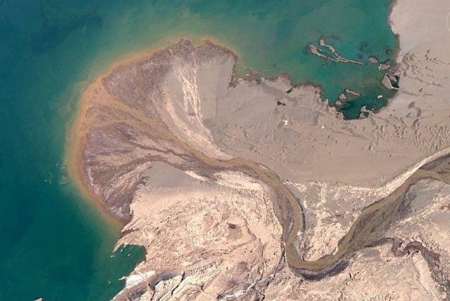 "Un delta que se construye en el lago Ayyakum, el Tíbet. El río no tiene nombre en Google. Se alimenta con nieve derretida desde las montañas hacia el sur".