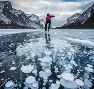 Una travesía donde esperaba encontrar entornos que le inspiraran tomar algunas de esas fotografías de alucinantes paisajes, pero la sorpresa se la llevó cuando echó la vista al suelo, mientras pisaba el agua congelada del lago Minnewanka.
