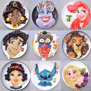 Entre sus platos se encuentran muchos personajes del mundo de Disney como Ariel, Mama Coco, Stitch, Jasmine o Cruella de Vil, pero también ha hecho personajes públicos como: Amy Winehouse, Will Smith o Karl Lagerfeld.