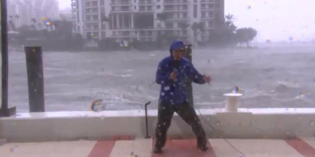 Mike Seidel, meteorólogo y presentador del canal del tiempo que trabaja para distintas cadenas de televisión como NBC, MSNBC y CNBC y su equipo de grabación estuvieron a pie de calle para documentar y contar de primera mano todo lo que estaba pasando mientras Irma se acercaba. En las siguientes imágenes se puede ver a Mike aguantando como puede el viento que ya sopla fuerte en la costa.