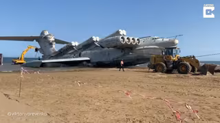 El conocido coloquialmente como el "monstruo del Mar Caspio", uno de los vehículos más inusuales de la Guerra Fría, se levanta de su tumba remolcado por un grupo de operarios en una playa local.