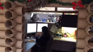 Una cosa es decorar un poco tu lugar de trabajo cuando llega la Navidad, y otra cosa es lo que ha hecho esta mujer: ha convertido su puesto de trabajo en una atracción navideña a la que no le falta detalle. Ha cercado su mesa con 'maderas' simulando una casa con su techo nevado y todo, la puerta está enmarcada por dos arbolitos de Navidad, y en el interior también se intuye otro. Vamos, que no le falta detalle.