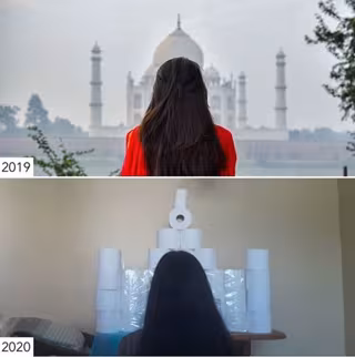 Desde posar frente a un Taj Mahal creado con papel higiénico hasta con una tabla de planchar como si fuera una tabla de surf. Estas son algunas de sus fotografías: