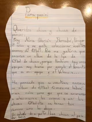 "Queridos chicos y chicas de Panini. Soy Núria Cebrián Bernabé, tengo 8 años y me gusta coleccionar vuestros cromos de fútbol. Pero me gustaría que sacarais un álbum de la liga de fútbol de chicas, porque también hay unos equipos muy buenos, por ejemplo, el Levante que es mi equipo, y el Valencia...", dice en la carta. "He pensando que si vosotros sacáis un álbum de fútbol femenino habrá más niñas como yo que se animaran a coleccionar los cromos, y así las chicas futbolistas se harán tan famosas como los chicos. Un saludo de mi parte. ¡Las chicas al poder! Núria".