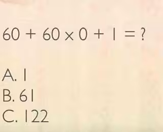 Se soluciona sumando y multiplicando por orden: de izquierda a derecha. Así, el resultado sería: 60 + 60= 120. Después se multiplica 120 x 0, y por último se suma el 1, dando como resultado 1. No es correcto porque para solucionar correctamente este problema debemos utilizar la regla de orden matemático PEMDAS (Paréntesis, Exponentes, Multiplicación, División, Adición y Sustracción) Se empieza calculando lo que hay entre paréntesis, después los exponentes, y en ese orden hasta la resta. Lo que nos lleva a la opción B.