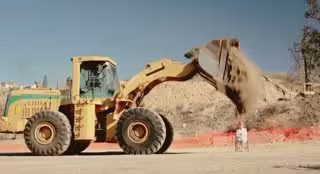 En los clips se puede ver a la anciana soportando el peso de un montón de arena que cae de una grúa.