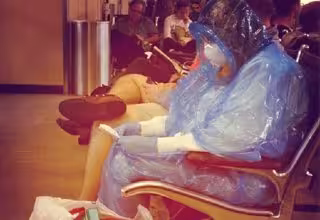 Un pasajero que esperaba su vuelo en el Aeropuerto Internacional de Dulles, a las afueras de Washington D.C., fue fotografiado en la sala de espera vestido con un sistema de protección de plástico cubriendo todo su cuerpo, mascarilla y guantes.