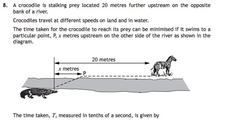 EL tiempo que necesita el cocodrilo para llegar hasta su presa puede reducirse si nada 'x' metros corriente arriba hasta un punto 'P', situado en la otra orilla, tal y como se muestra en la imagen.