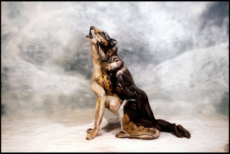 Para lograr transformar a estas tres mujeres en un lobo, a Stötter le llevó días pensar y hacer factible el diseño. "Había intentado diseñar un lobo de pie pero no funcionó", dijo en una entrevista a Metro. "Después me pregunté si funcionaría sentado y aullando y enseguida saqué una pluma y un pedazo de papel e hice un pequeño boceto", explicó.