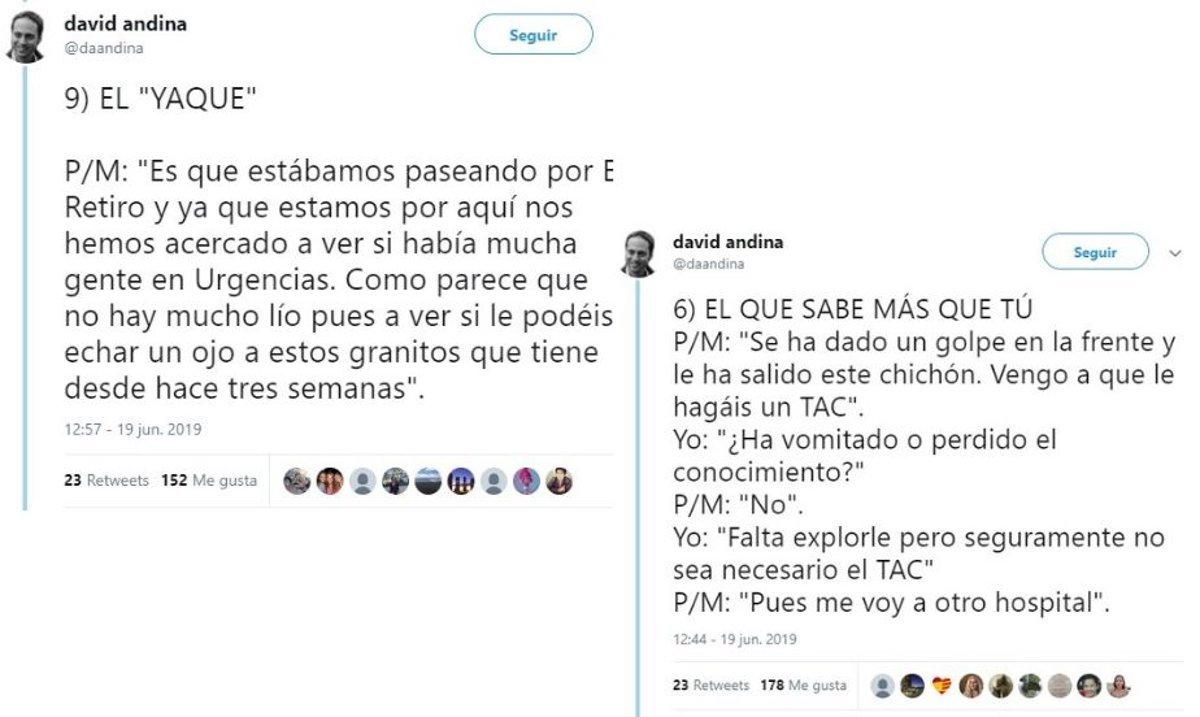 Tal vez una tos que se resiste. Dolor de cabeza, fiebre por una vacuna o un catarro que no se despega. Según la Encuesta Nacional de Salud de España, una media del 50% de los niños españoles comprendidos entre los 0 y 4 años hicieron uso de los servicios de urgencias en el año 2017. Frente a estos resultados, algunos profesionales sanitarios lanzan sus propios diagnósticos pero no a los niños, a los padres que acuden con ellos. En este caso ha sido un pediatra de Madrid quien ha decidido concienciar con humor a los progenitores enumerando los 12 tipos de padres con los que se ha encontrado en un hospital y ha pedido que "piensen si es una verdadera urgencia para la próxima".