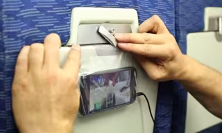 5. Si viajas en tren o en avión y quieres ver cómodamente una película. Acuérdate de llevar contigo una bolsa de congelar comida y aprovecha la bandeja del asiento delantero para colgar tu móvil a modo de pantalla.