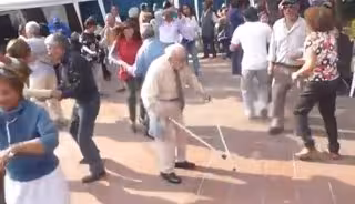 Todo comienza cuando este buen hombre de edad avanzada escucha una canción que le debía traer buenos recuerdos en la celebración de una boda. Entonces se lanza a bailar, pero tiene ocupadas las manos con las muletas que le ayudan a caminar.