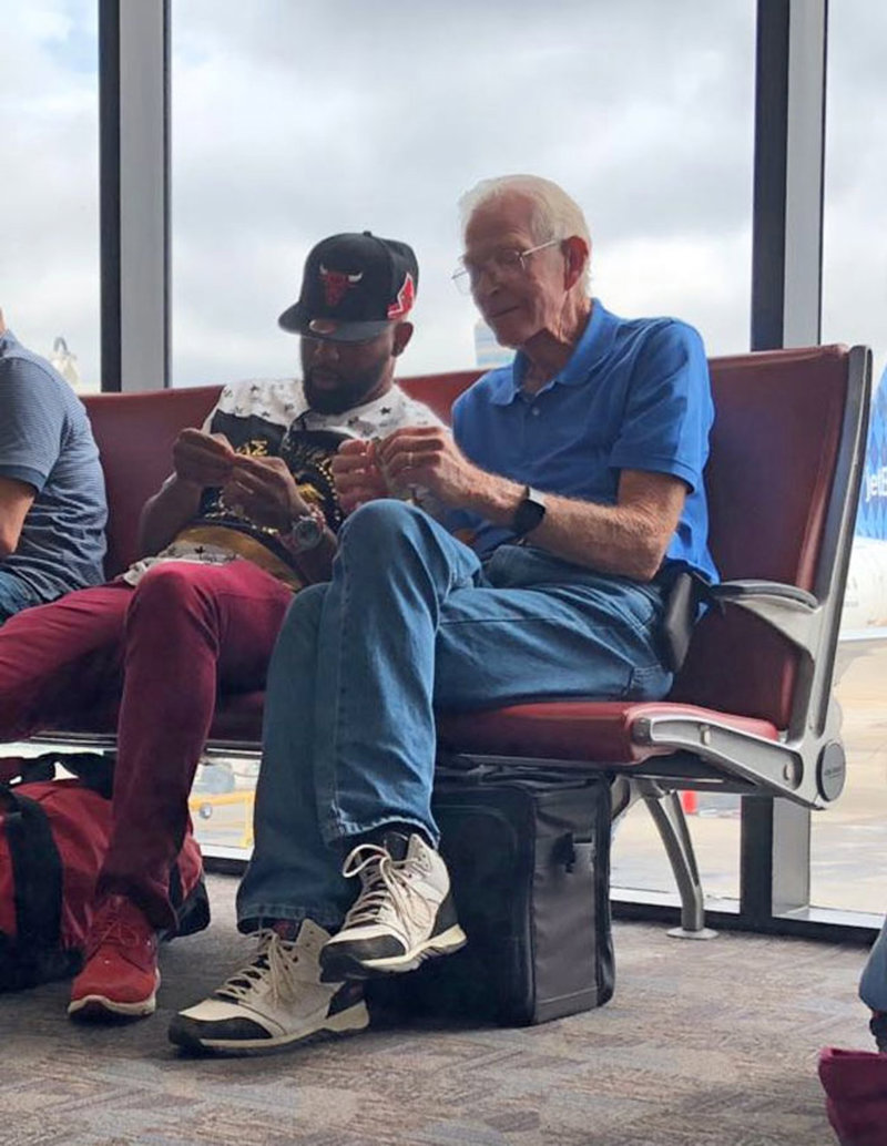 Un simple gesto: Un hombre mayor le enseña al más joven cómo hacer un origami con un dólar