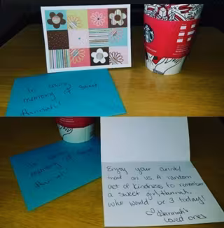 Disfruta tu bebida, yo invito. Un acto de amabilidad al azar para recordar a la dulce niña Hannah, que haría 3 años hoy. Firmado: Las personas que Ana quería”.